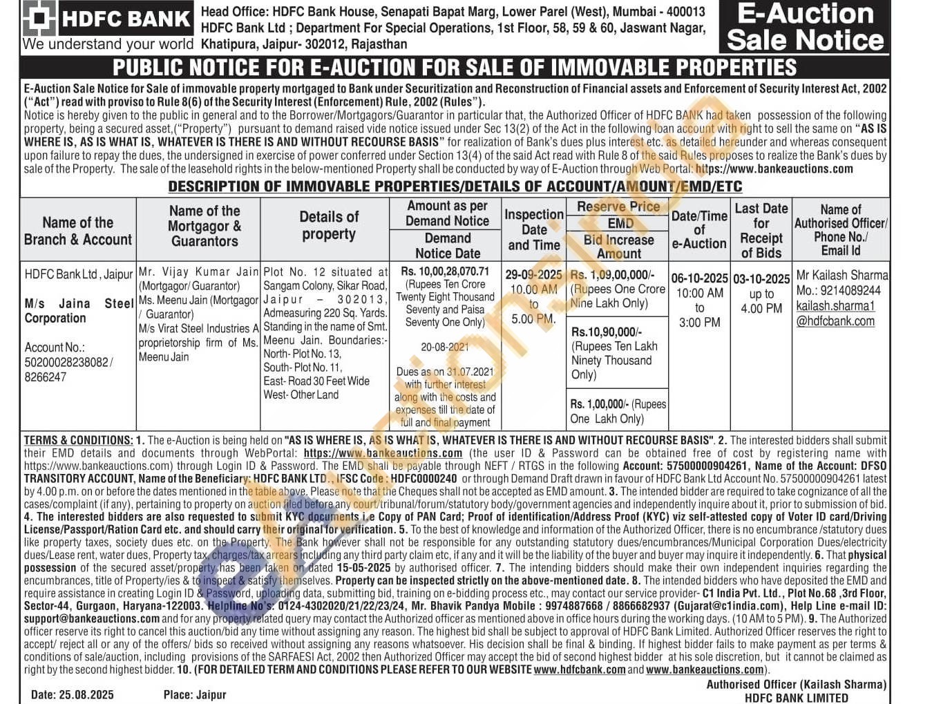 Jaipur Plot No. 12 situated at Sangam Colony, Sikar Road, 302013, Admeasuring 220 Sq. Yards. Standing in the name of Smt. Meenu Jain. Boundaries:-North-Plot No. 13, South-Plot No. 11, East-Road 30 Feet Wide West-Other Land