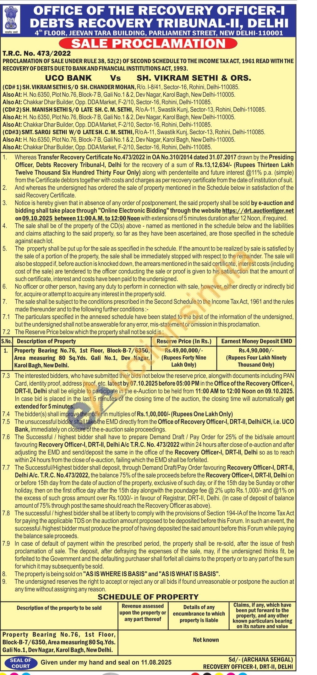 Property Bearing No.76, 1st Floor, Block-B-7/6350, Area measuring 80 Sq.Yds. Gali No.1, Dev Nagar, Karol Bagh, New Delhi.