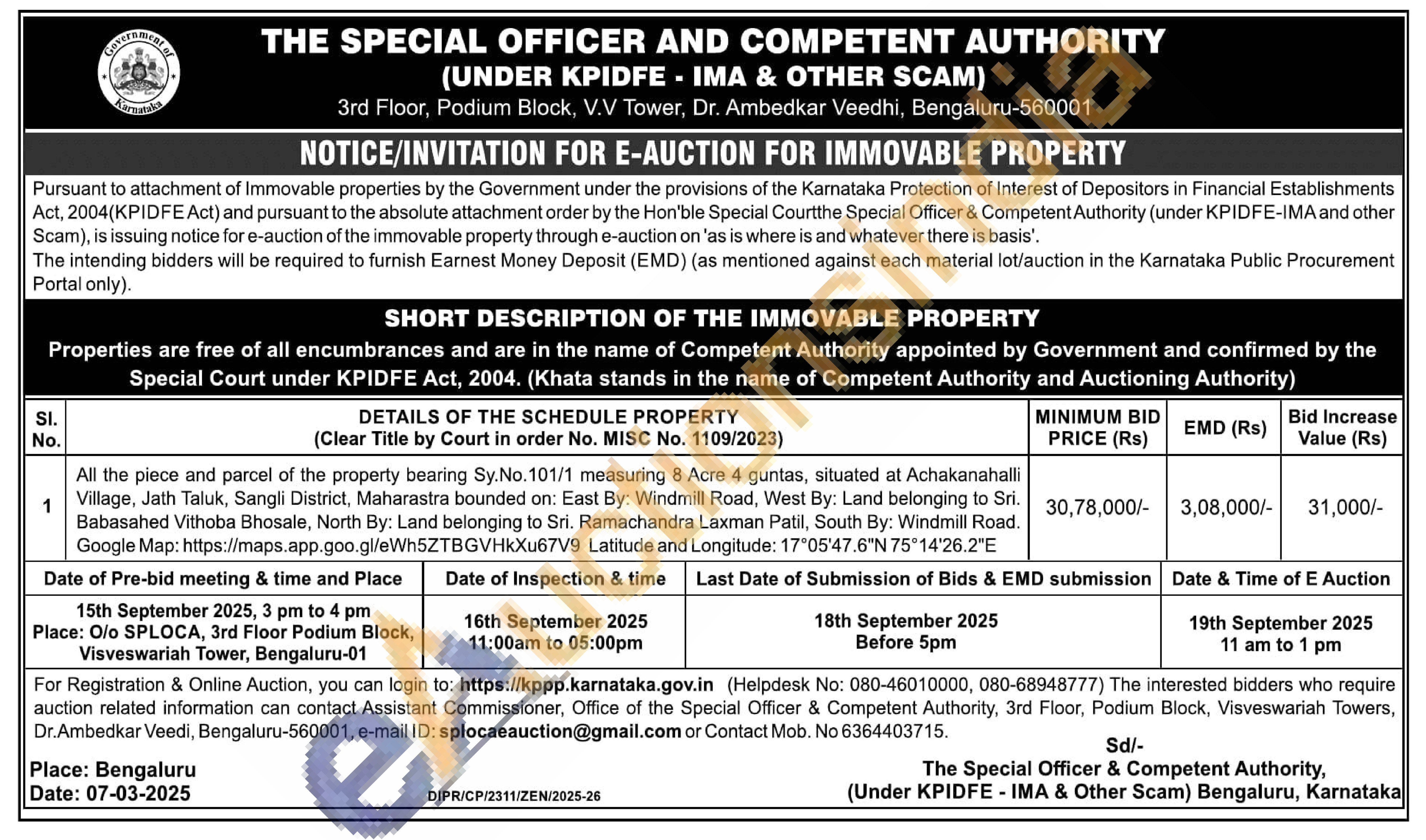 All the piece and parcel of the property bearing Sy.No.101/1 measuring 8 Acre 4 guntas, situated at Achakanahalli Village, Jath Taluk, Sangli District, Maharastra bounded on: East By: Windmill Road, West By: Land belonging to Sri. Babasahed Vithoba Bhosale, North By: Land belonging to Sri. Ramachandra Laxman Patil, South By: Windmill Road. Google Map: https://maps.app.goo.gl/eWh5ZTBGVHkXu67V9 Latitude and Longitude: 17°05'47.6″N 75°14'26.2"E