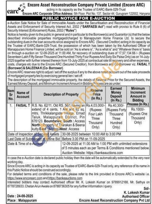R.S. No. 62/11, Old RS. 56/1 having an extend of 4 cents, 1 Are and 62 sq. mtrs, Thrikkalangode Village, Ernad Taluk, Malappuram District, Pin 676123. Boundaries: South: Access North: Property of Tharakan & Beena kutty East: Access West: Access