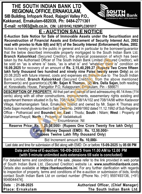 All that part and parcel of land admeasuring 46.14 Ares (114) cents) along with all other constructions, improvements, easementary rights existing and appurtenant thereon situated in Sy No. 708/1A/64, 708/1A/102 and 708/1A/98 within Kadavoor Village, Kothamangalam Taluk, Ernakulam District and owned by Mr. Sajan K Thomas and Della Sajan morefully described in Sale Deed No. 2499/1992 dated 11.12.1992 of Sub Registrar Office - Pothanicad and Bounded on: East: Thodu; South: Nilam; West: Property of Ulahannan Thayyil; North: Property of Vadakkekudi