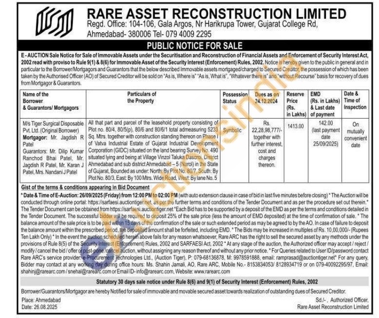 All that part and parcel of the leasehold property consisting of Plot no. 80/4, 80/5(p), 80/6 and 80/6/1 total admeasuring 5233 Sq. Mtrs together with construction standing thereon on Phase I of Vatva Industrial Estate of Gujarat Industrial Development Corporation (GIDC) situated on the land bearing Survey No. 490 situated lying and being at Village Vinzol Taluka Dascroi, District Ahmedabad and sub district Ahmedabad-5 (Narol) in the State of Gujarat, Bounded as under: North: By Plot No. 80/7, South: By Plot No. 80/3, East: By 100 Mtrs. Wide Road, West: By lane No. 5