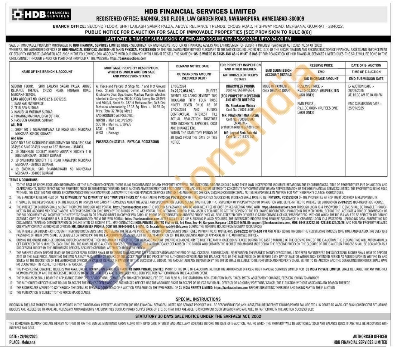 All Piece and Parcels of Shop No. 7 and 8 of Ground Floor, Sharda Shopping Center, Panchland Road, Krishna No Dhal, Opp. Govind Madhav Mandir, which is situated in Survey No. 2004/IP City Survey No. 3649/3 and 3649/4, Sheet No. 187 of Mehsana Sim, Ta & Dist Mehsana admeasuring 16.35 Sq. Mirs + 16.35 Sq Mrs. (Total 32.70 Sq. Mrs.)