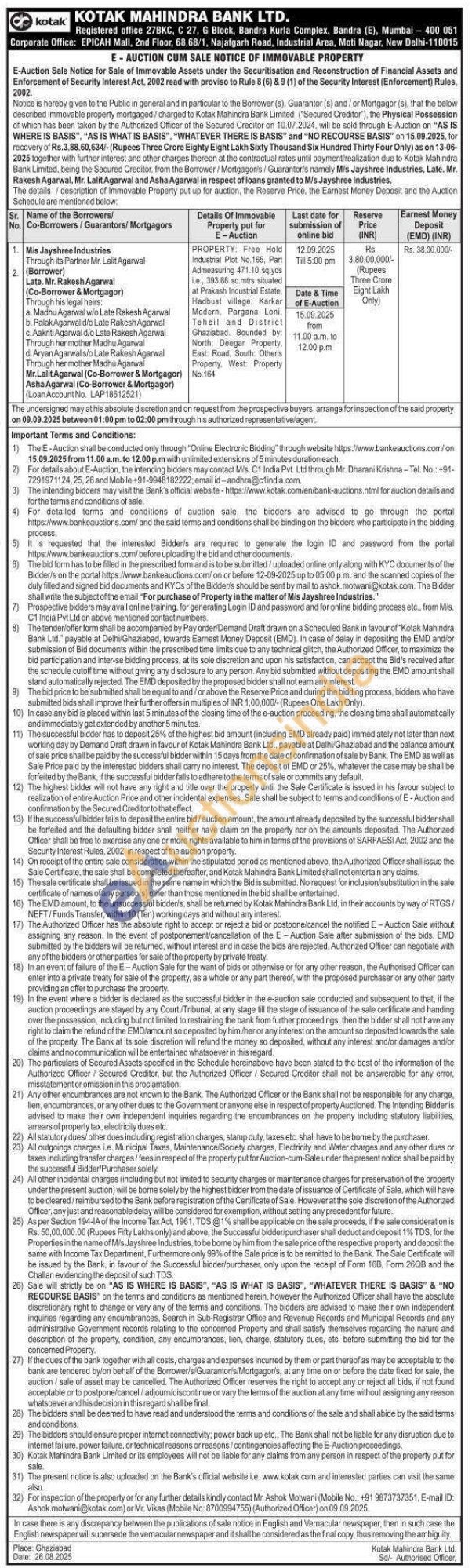 PROPERTY. Free Hold Industrial Plot No. 165, Part Admeasuring 471.10 sq yds Le, 393.88 sq.mtrs situated at Prakash Industrial Estate, Hadbust village, Karkar Modern, Pargana Loni, Tehsil and District Ghaziabad. Bounded by: North: Deegar Property. East: Road, South: Other's Property, West Property No.164