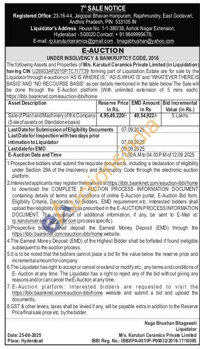 Sale of Plant and Machinery of the Company (Sale of assets on Standalone basis