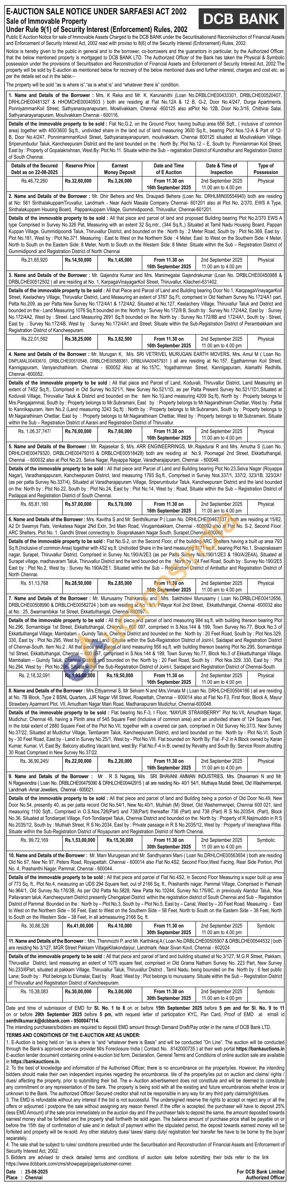 All that piece and parcel of Flat No.4S2, in Second Floor Measuring a super built up area of 773 Sq. ft., Plot No.4, measuring an UDS 294 Square feet, out of 2166 Sq. ft., Prashanthi nagar, Pammal Village, Comprised in Paimash No.964/1, Old Survey No.176/3B, As per Old Patta No.5828, New Patta No.10244, Survey No.176/8C, in previously Alandur Taluk, Now Pallavaram taluk, Kancheepuram District presently Chengalpet District within the registration district of South Chennai and Sub - Registration District of Pammal Bounded on the North by - Plot No.3, South by - Plot No.5, East by - Canal, West by - 20 Feet Road. Measuring :- East to West on the Northern Side - 56 Feet, East to West on the Southern Side - 58 Feet, North to South on the Eastern Side - 38 Feet, North to South on the Western Side - 38 Feet, In all admeasuring 2166 Sq. ft.
