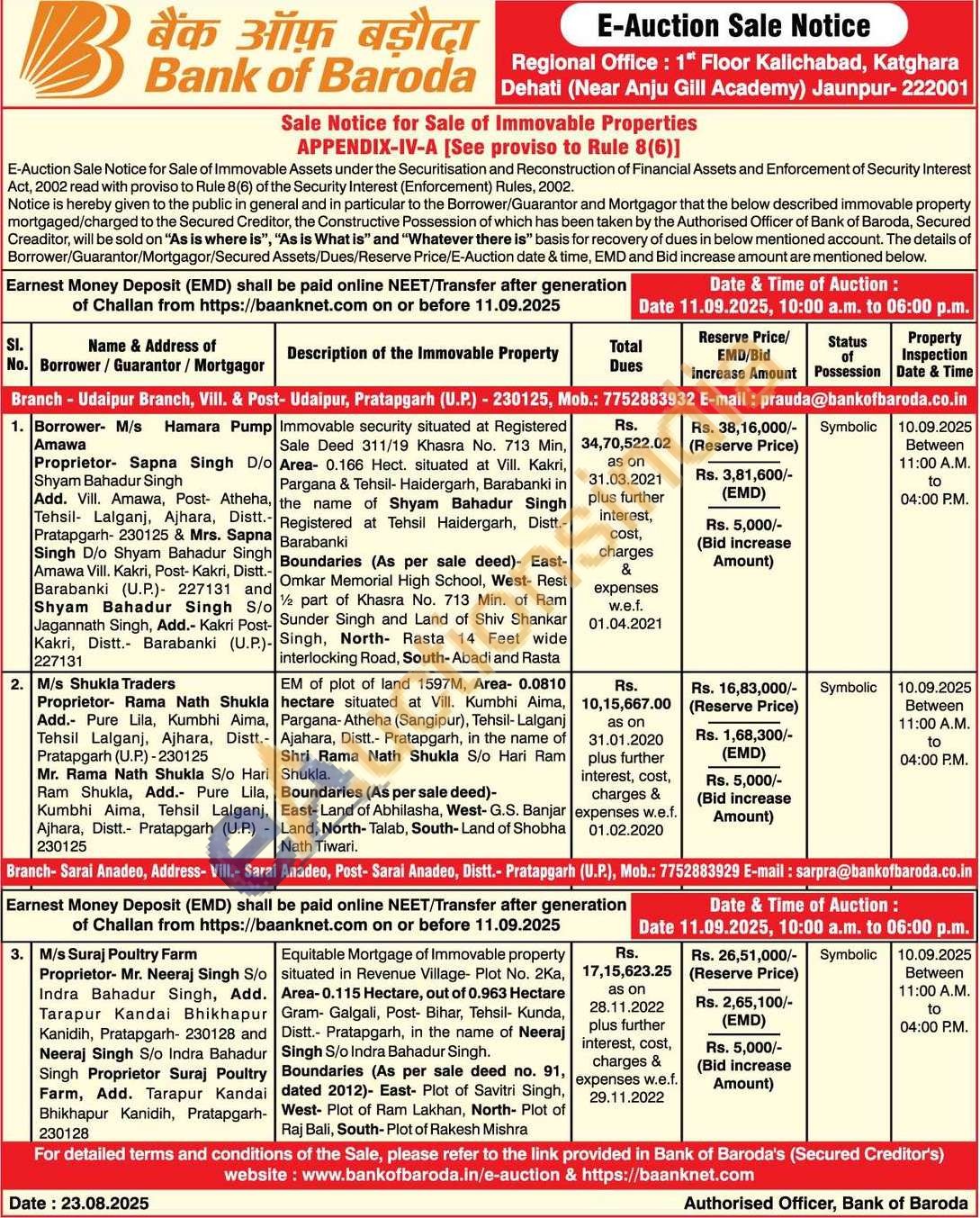 3) Equitable Mortgage of Immovable property situated in Revenue Village- Plot No. 2Ka, Area-0.115 Hectare, out of 0.963 Hectare Gram- Galgali, Post- Bihar, Tehsil- Kunda, Distt.- Pratapgarh, in the name of Neeraj Singh S/o Indra Bahadur Singh. Boundaries (As per sale deed no. 91, dated 2012)- East- Plot of Savitri Singh, West- Plot of Ram Lakhan, North- Plot of Raj Bali, South-Plot of Rakesh Mishra