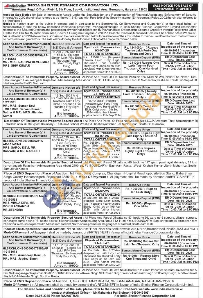 Description Of The Immovable Property/Secured Asset: All Piece And Parcel Of Patta No.02,Book No.44,G.P Amarpura Theri hanumangarh Rj Total land adm. 3078 Sq feet Boundary:-East-Govt School, West-H/O Koshaliya/Sohan Lal, North-Road, South-H/O Ramdev,