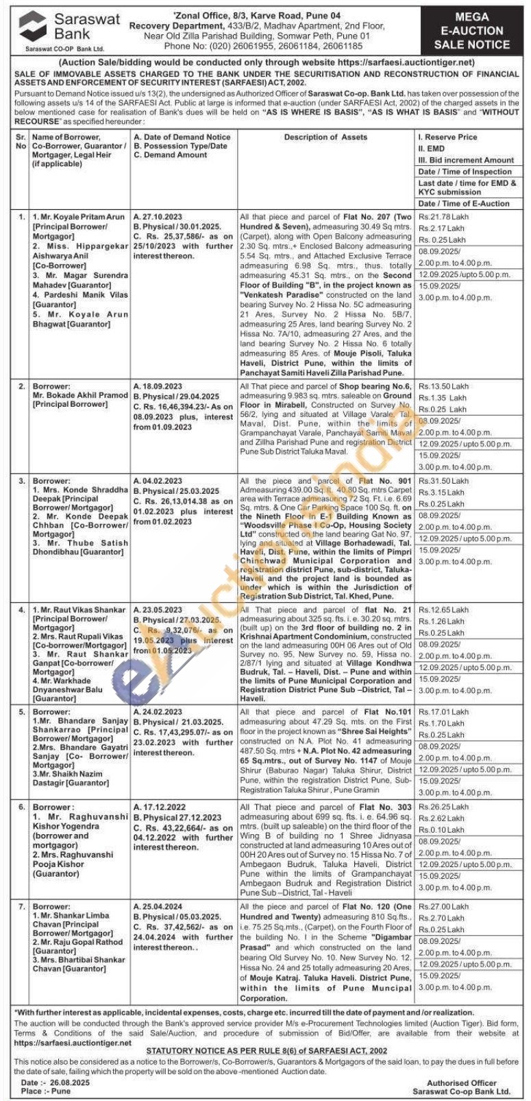 All the piece and parcel of Flat No. 120 (One Hundred and Twenty) admeasuring 810 Sq.fts.. i.e. 75.25 Sq.mts.. (Carpet), on the Fourth Floor of the building No. I in the Scheme "Digambar Prasad" and which constructed on the land. bearing Old Survey No. 10. New Survey No. 12. Hissa No. 24 and 25 totally admeasuring 20 Ares, of Mouje Katraj. Taluka Haveli. District Pune, within the limits of Pune Muncipal Corporation.