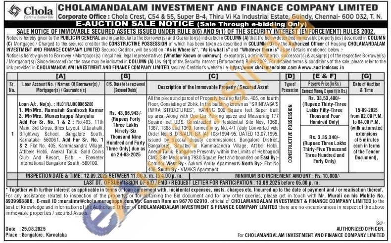 All the piece and parcel of Property bearing flat No. 405, on fourth Floor, Consisting of 2bhk, In the building known as "SRINIVASA'S INFRA STRUCTURES", HAVING 900 Square feet Super built up area, Along with One Car Parking space and Measuring 177 Square feet UDS, Constructed on Residential Site Nos, 1366, 1367, 1368 and 1369, formed in sy No, 4/1 (duly Converted vide Order No. B, DIS/ALN. SR (A) 108/1994-95, DATED 13.07.1995. issued by special duputy commissioner, Bangalore District, Bangalore). Situated at Kammasandra Village. Attibel Hobli, Anekal Taluk, Bangalore Presently within the Limits of Hebbagodi CMC, Site Measuring 7930 Square Feet and bounded on East By:-Corridor West By:- Aakruti Amity Apartments North By: Flat No 406, South By:-VMAKS Apartment.