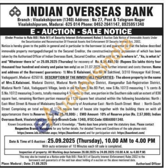 DESCRIPTION OF THE IMMOVABLE PROPERTIES: The above property in the name of Mrs.S.Kalaivani. Madurai District, Madurai North Registration District, Alanganallur Sub-Registration District, Madurai North Taluk, Vadugapatti Village, lands in old Natham S.No.60 Part, new S.No. 107/3 measuring 1% cents & S.No. 107/2 measuring 3 cents, totally measuring 4% cents. In that, one portion in the Southern side sold an extent of 836 square feet, remaining Northern portion measuring 1126 square feet situated within the following boundaries: North: East-West Street & House of Malaisamy South: Property of Arunkumar East: North-South Street West: North-South Street Comprising an total extent of 1126 square feet of house site together with the building there on with all appurtenances there to Reserve Price: Rs. 25,70,000/-: EMD Amount 10% of Reserve price (Rs. 2,57,000); Indian Overseas Bank, Visalatchipuram Branch (Branch Code: 1340), IFSC Code: 10BA0001340
