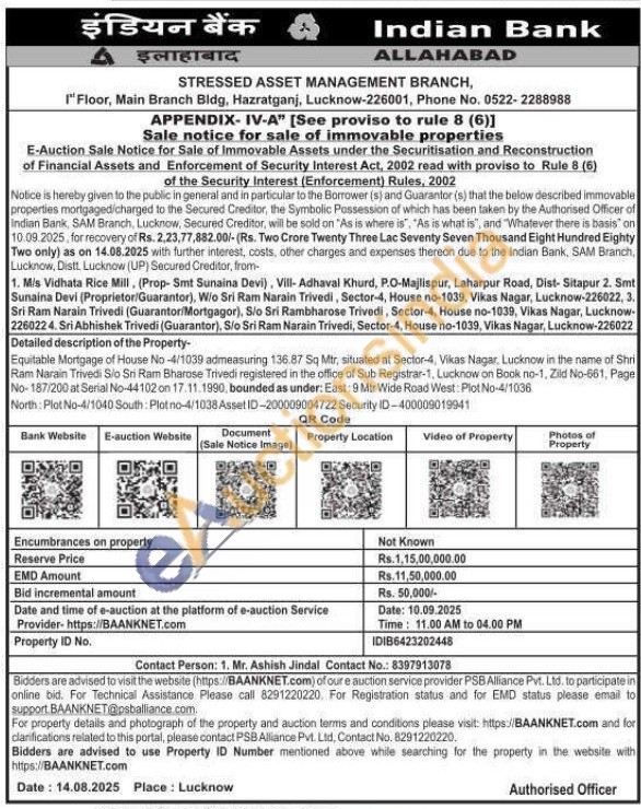Equitable Mortgage of House No-4/1039 admeasuring 136.87 Sq Mtr, situated at Sector-4, Vikas Nagar, Lucknow in the name of Shri Ram Narain Trivedi Sio Sri Ram Bharose Trivedi registered in the office of Sub Registrar-1, Lucknow on Book no-1, Zild No-661, Page No-187/200 at Serial No-44102 on 17.11.1990, bounded as under: East: 9 Mtr Wide Road West: Plot No-4/1036 North: Plot No-4/1040 South: Platno-4/1038 Asset ID-200009004722 Security ID-400009019941
