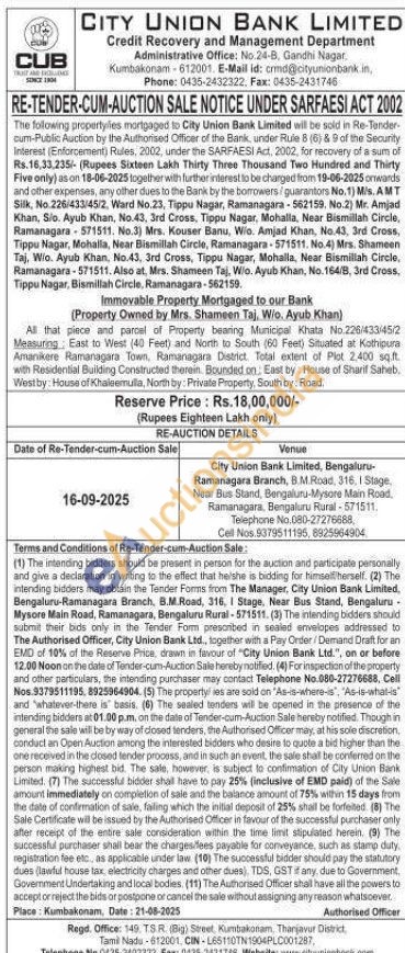 All that piece and parcel of Property bearing Municipal Khata No. 226/433/45/2 Measuring East to West (40 Feet) and North to South (60 Feet) Situated at Kothipura Amanikere Ramanagara Town, Ramanagara District. Total extent of Pist 2,400 sq.ft with Residential Building Constructed therein. Bounded on, East by: House of Sharif Saheb, Westby: House of Khaleemulla, North by: Private Property, South by: Road
