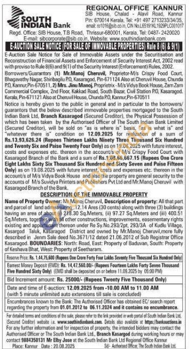 Name of Property Owner: Mr Manoj Cheruvil, Description of property: All that part and parcel of land admeasuring 12.14 Ares (30 cents) along with three (3) buildings having an area of about (i) 218.30 Sq.Meters, (i) 97.27 Sq.Meters and (iii) 400.51 Sq.Meters, together with all other constructions, improvements, easementary rights existing and appurtenent thereon under Re Sy. No.293/2pt, 293/3A of Kudlu Village, Kasargod Taluk, Kasaragod District and owned by Mr.Manoj Cheruvil, more fully described in Jenm Sale deed No.3671/12 dated 21.06.2012 of Sub Registrar Office Kasaragod. BOUNDARIES: North: Road, East: Property of Baduvan, South: Property of Keshava Bhat, West: Property of Seetharam.