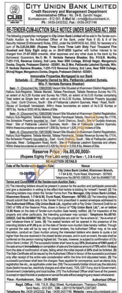 Item-1: (Document No. 1388/2006) Vacant Site Situated at Khammam District Registration, Kalluru Sub-Registrar, Tallada Mandal, Tallasa Panchayat, Tallada Revenue Survey No.175, an extent of Ac.0.29 Kuntas and Survey No.176/A, an extent of Ac.0.03 Kuntas comprising Total extent as Single item with an extent of Ac.0.32 Kuntas. Schedule Property bounded by: East: Gunti Cheruvu, South Site of Patibanda Lakshmi Syamala, West: Road, North: House of Guntipalli Venkataiah, Within these boundaries an extent of Ac.0.32 Kuntas or 3872 Sq. Yards or 3252.48 Sq.Meters of Site. Item-3: (Document No. 1385/2006) Vacant Site Situated at Khammam District Registration, Kalluru Sub-Registrar, Tallada Mandal, Talasa Panchayat Tallada, Revenue Survey No.177/B, the Schedule Property bounded by: East: Gunti Cheruvu, South Site of Gurijala Anasuya, West: Site of Patibanda Lakshmi Syamala, North Site of Patibanda Lakshmi Syamala. Within these boundaries an extent of 1,936 Sq. Yards or 1,626.24 Sq. Meters of Site. Item-4: (Document No. 1387/2006) Vacant Site Situated at Khammam District Registration, Kalluru Sub-Registrar, Tallada Mandal, Talasa Panchayat, Tallada Revenue Survey No. 177/A, the Schedule Property bounded.try. East: Gunti Cheruvu, South: Site of Patbanda Lakshmi Syamala, West: Goliagudem Road, North: Site of Patibanda Lakshmi Syamala and others. Within these boundaries an extent of 2,420 Sq. Yards or 2,032.8 Sq. Meters of Site