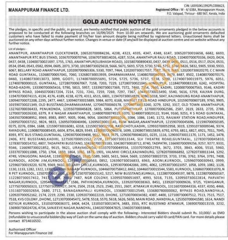 Manappuram Finance Ltd Gold Auctions Auction in Anantapur