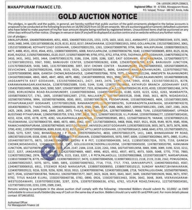 Manappuram Finance Ltd Gold Auctions Auction in Amalapuram