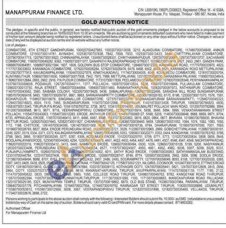 Manappuram Finance Ltd Gold Auctions Auction in Coimbatore