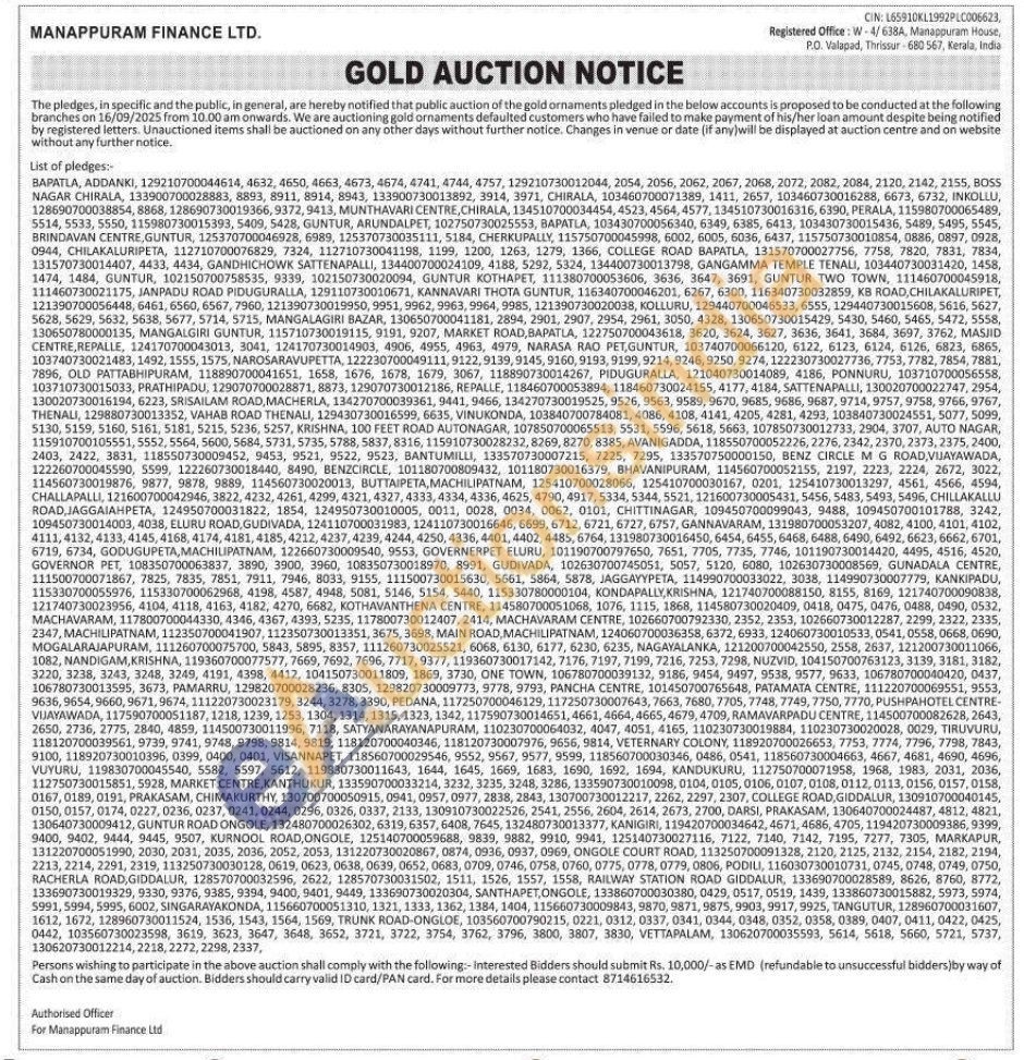 Manappuram Finance Ltd Gold Auctions Auction in Bapatla