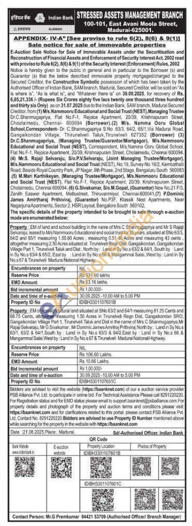 Contact Person: Mr.G Premkumar 94421 53709 (Authorised Officer/ Branch Manager)