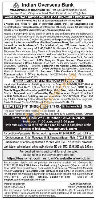 Land and Residential Building located in Door No.888/D8B,888/D8B-1 & 888/D88-2, Plot No.7, R.S.No. 77/7,77/8 & 77/6, TS No.8/4C, SMR Street, Gandhi Nagar, Karuthapulianpatti Village, Melur Town, Melur Taluk, Madurai District, Tamilnadu which is Owned by Mrs T Manonmani. Extent of the Land is 1732.50 Sq ft and Building:-As per execution: GF-1042 Sq.ft, Porch 258 Sq.ft & FF-1257 Sq.ft Boundaries: North-Vacant Site of Muthammal Vagayara. East-Plot No.6, South-20 Ft Breath Pathway, West-Plot No. 7A