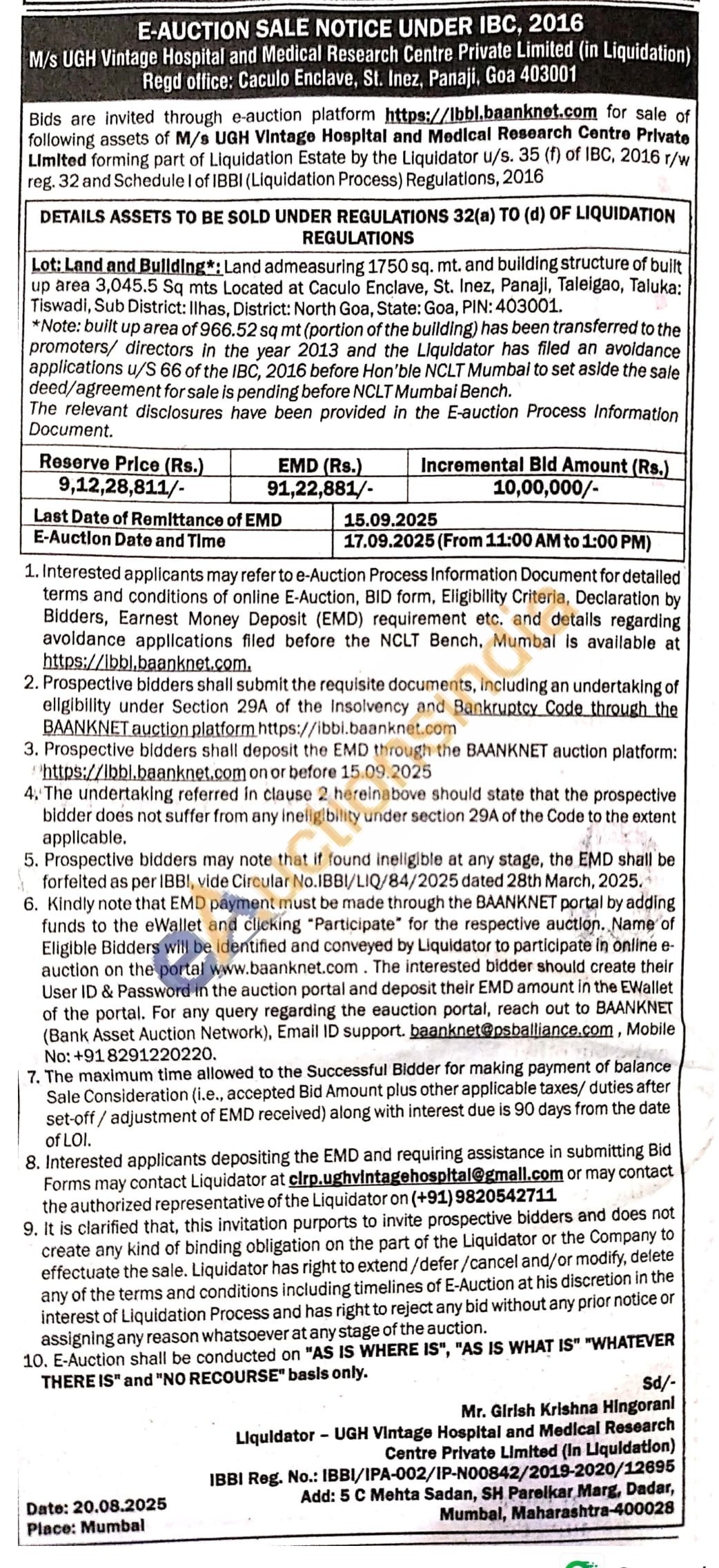 Lot: Land and Bullding*: Land admeasuring 1750 sq. mt. and building structure of built up area 3,045.5 Sq mts Located at Caculo Enclave, St. Inez, Panaji, Taleigao, Taluka: Tiswadi, Sub District: Ilhas, District: North Goa, State: Goa, PIN: 403001. *Note: built up area of 966.52 sq mt (portion of the building) has been transferred to the promoters/ directors in the year 2013 and the Liquidator has filed an avoldance applications u/S 66 of the IBC, 2016 before Hon'ble NCLT Mumbal to set aside the sale deed/agreement for sale is pending before NCLT Mumbal Bench. The relevant disclosures have been provided in the E-auction Process Information Document