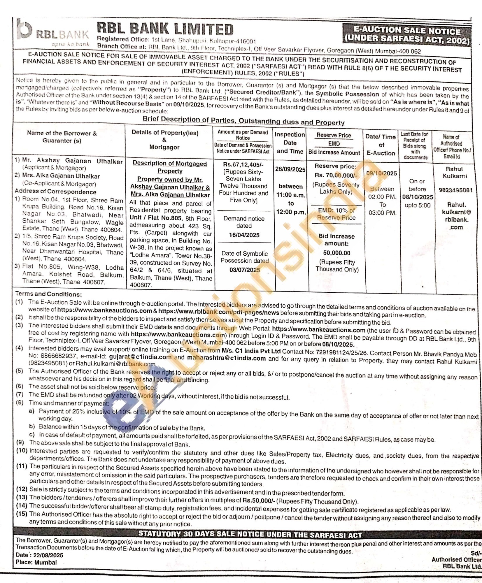 All that piece and parcel of Residential property bearing Unit/Flat No.805, 8th Floor, admeasuring about 423 Sq. Fts. (Carpet) alongwith car parking space, in Building No. W-38, in the project known as "Lodha Armara", Tower No.38-39, constructed on Survey No. 64/2 & 64/6, situated at Balkum, Thane (West), Thane 400607.