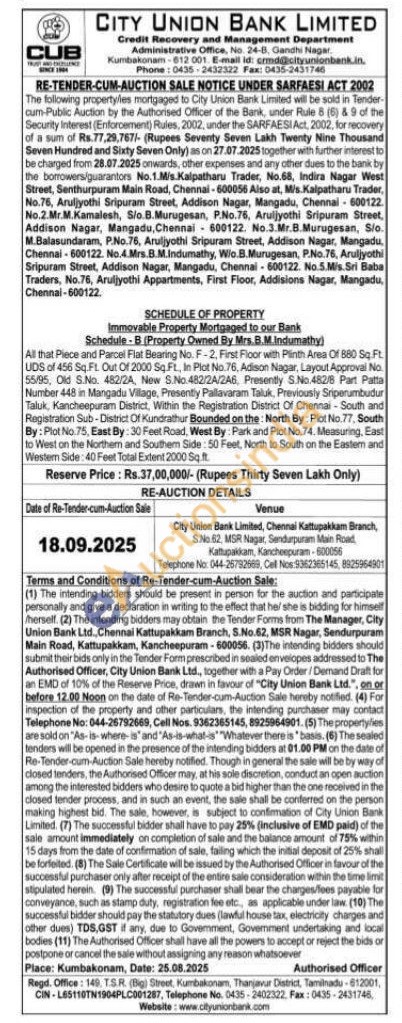 All that Piece and Parcel Flat Bearing No. F-2, First Floor with Plinth Area Of 880 Sq Ft. UDS of 456 Sq. FL. Out Of 2000 Sq. FL., In Plot No.76, Adison Nagar, Layout Approval No. 55/95, Old S.No. 482/2A, New S.No.482/2A/2A6, Presently S.No.482/8 Part Patta Number 448 in Mangadu Village, Presently Pallavaram Taluk, Previously Sriperumbudur Taluk, Kancheepuram District, Within the Registration District Of Chennai-South and Registration Sub-District Of Kundrathur Bounded on the: North By: Plot No.77, South By: Plot No.75, East By: 30 Feet Road, West By: Park and Plot No.74. Measuring, East to West on the Northern and Southem Side: 50 Feet, North to South on the Eastern and Westem Side: 40 Feet Total Extent 2000 Sq.ft.