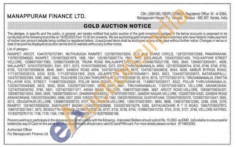 Manappuram Finance Ltd Gold Auctions Auction in Ranipet