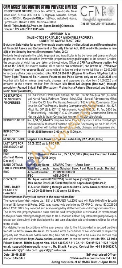 All That Piece Or Parcel Of Land Gat No. 161, Plot No.507(6) & 507 (13) San-gali Karnal Road, Padmale, Taluka-Miraj, Dist-Sangali Admeasuring Milkat 0.11 Are Out Of Total Plot Having Measuring 3.66 Are And Commercial Con-struction On That Property, Bearing Grampanchayat Assessment List No. 527, Mikat No. 507 (6) & 507 (13) Admeasuring About 7895 Sq. Ft. And 2600 Sq. Ft Respectively. Including R.C.C. Structure Building Construction Therean Having Light & Water Connection. Alongwith All Movable Assets