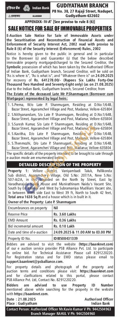 Property 1: Vellore District, Vaniyambadi Taluk, Pallikonda Sub district, Agaramchery Village, Old S.No: 207/1A, New S.No: 507-A/2A, in this bounded on the North by Street, East by Varadharajulu Naidu House and Munirathinam Naidu's Vacant Site, South by Eri Kalavai and West by Subramaniya Mudiliars Vacant site, in between street side East to West 39 ft, North to South 42 feet, Total area 1638 Sq.ft and a house which is in built in it