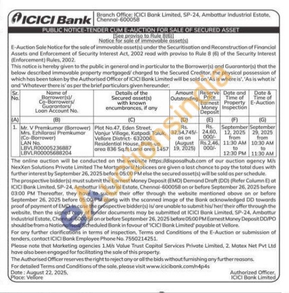 Plot No.47. Eden Street, Vanjur Village, Katpadi Taluk, Vellore District-632006. Residential House. Built-up area 836 Sq.ft Land area 1457