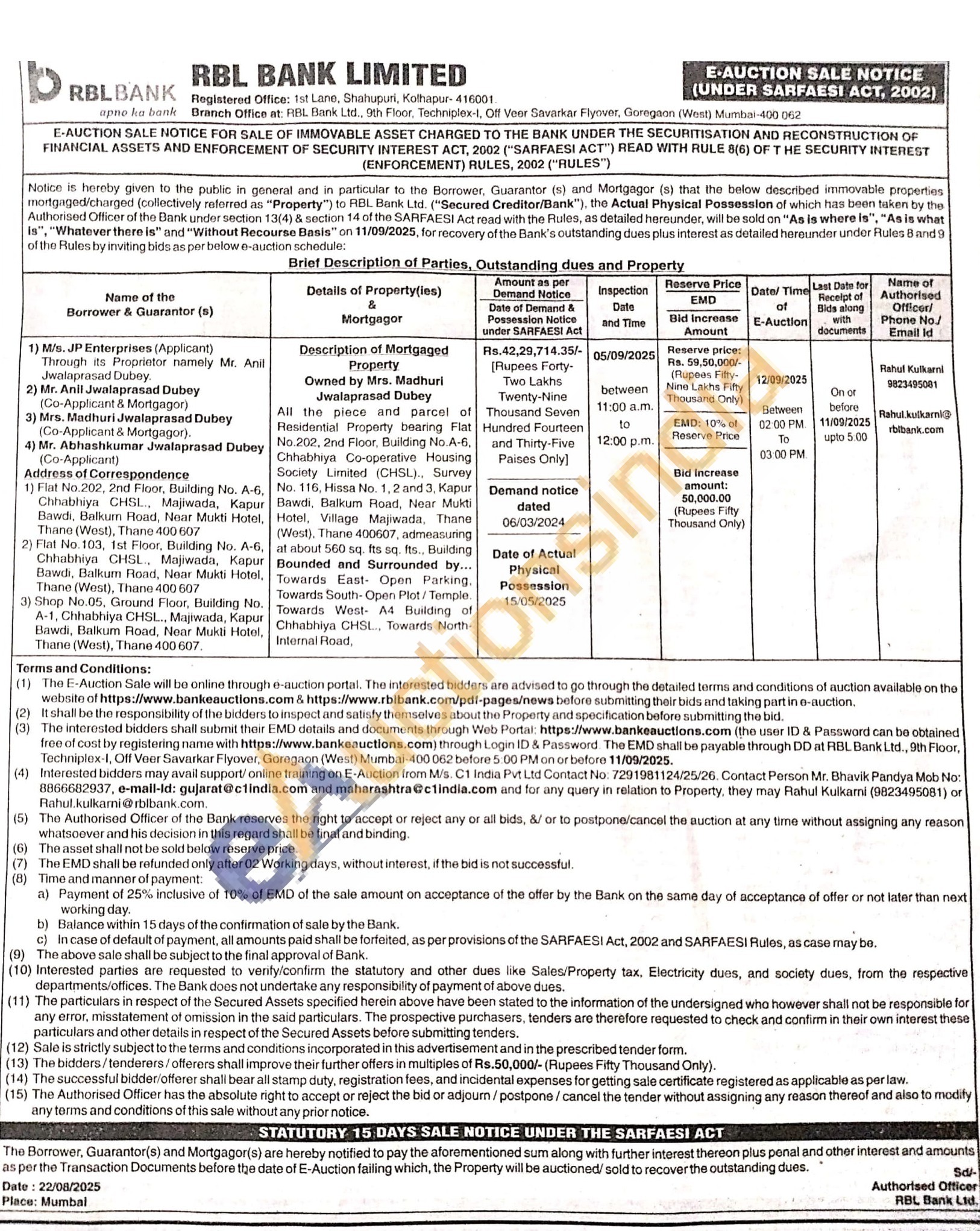 All the piece and parcel of Residential Property bearing Flat No.202, 2nd Floor, Building No.A-6, Chhabhiya Co-operative Housing Society Limited (CHSL).. Survey No. 116, Hissa No. 1, 2 and 3. Kapur Bawdi, Balkum Road, Near Mukti Hotel, Village Majiwada, Thane (West), Thane 400607, admeasuring at about 560 sq. fts sq. fts., Building Bounded and Surrounded by... Towards East- Open Parking. Towards South-Open Plot/Temple. Towards West A4 Building of Chhabhiya CHSL... Towards North-Internal Road
