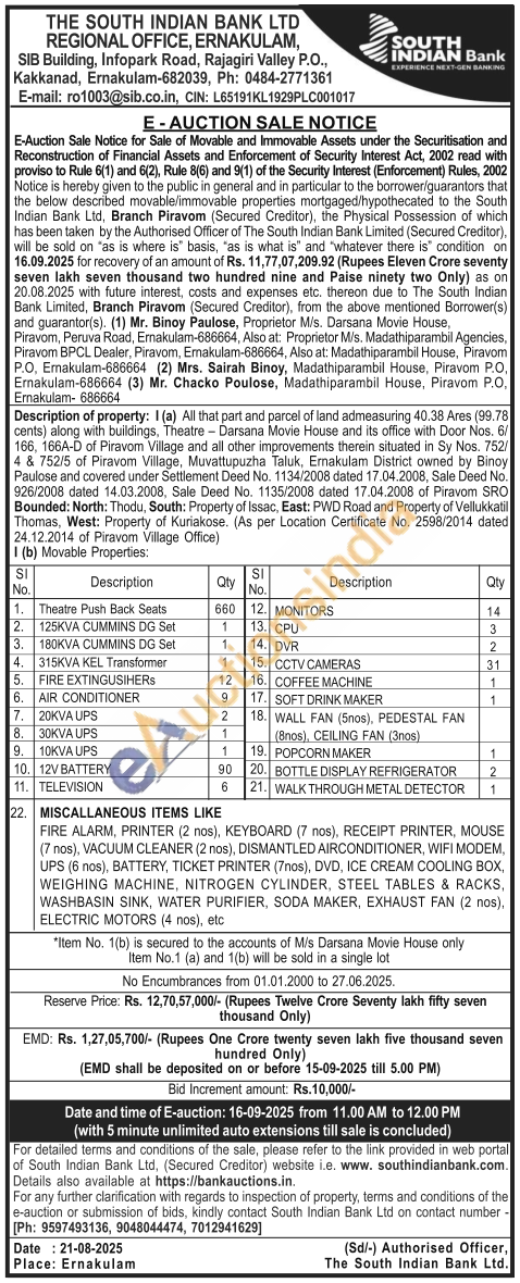 (a) All that part and parcel of land admeasuring 40.38 Ares (99.78) cents) along with buildings. Theatre Darsana Movie House and its office with Door Nos. 6/166, 166A-D of Piravom Village and all other improvements therein situated in Sy Nos. 752/4 & 752/5 of Piravom Village, Muvattupuzha Taluk, Ernakulam District owned by Binoy Paulose and covered under Settlement Deed No. 1134/2008 dated 17.04.2008, Sale Deed No. 926/2008 dated 14.03.2008, Sale Deed No. 1135/2008 dated 17.04.2008 of Piravom SRO Bounded: North: Thodu, South: Property of Issac, East: PWD Road and Property of Vellukkatil Thomas, West: Property of Kuriakose. (As per Location Certificate No. 2598/2014 dated 24.12.2014 of Piravom Village Office) 1(b) Movable Properties: