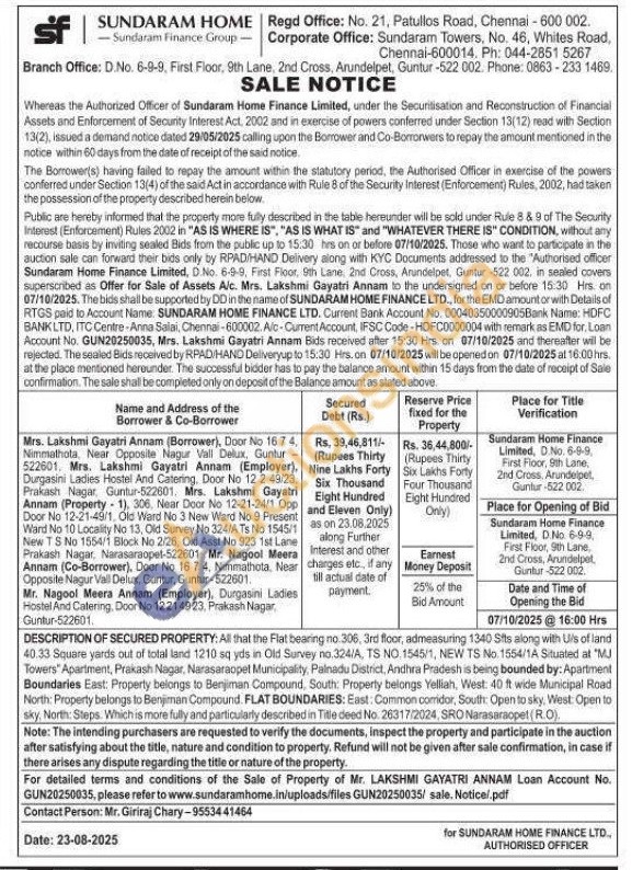 All that the Flat bearing no.306, 3rd floor, admeasuring 1340 Sits along with Uls of land 40.33 Square yards out of total land 1210 sq yds in Old Survey no.324/A, TS NO. 1545/1, NEW TS No. 1554/1A Situated at "MJ Towers" Apartment, Prakash Nagar, Narasaraopel Municipality, Palnadu District, Andhra Pradesh is being bounded by: Apartment Boundaries East: Property belongs to Benjiman Compound, South: Property belongs Yelliah, West: 40 ft wide Municipal Road North: Property belongs to Benjiman Compound. FLAT BOUNDARIES: East: Common corridor, South: Open to sky, West: Open to sky, North: Steps. Which is more fully and particularly described in Title deed No. 26317/2024, SRO Narasaraopet (RO).