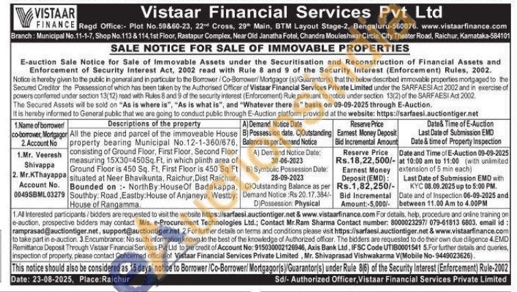 All the piece and parcel of the immoveable House property bearing Municipal No.12-1-360/676, consisting of Ground Floor, First Floor, Second Floor measuring 15X30-450Sq. Ft, in which plinth area of Ground Floor is 450 Sq. Ft, First Floor is 450 Sq. Ft situated at Neer Bhavikunta, Raichur, Dist Raichur. Bounded on: NorthBy: House Of Badakappa, Southby: Road, Eastby House of Anjaneya, Westby, House of Rangamma