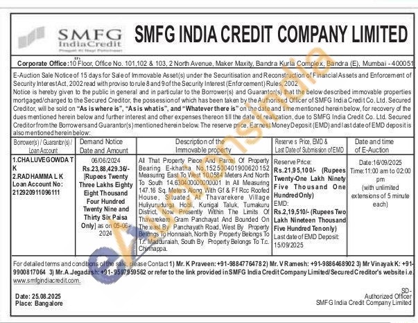 All That Property Piece And Parcel Of Property Bearing E-khatha No.152 500401900620152 Measuring East To West 10.0584 Meters And North To South 14.630400000000001 In All Measuring 147.16 Sq. Meters Along With Gt & Ff Roc Rooled House, Situated At Thavarekere Village Hullyurudurga Hobili, Kunigal Taluk, Tumakuru EMD: District, Now Presently Within The Limits Of Thavarekere Gram Panchayat And Bounded On The east By Panchayath Road, West By Property Belongs To Honnaiah. North By Property Belongs To Tr. Madduraiah, South By Property Belongs To T.c. Chinnappa.