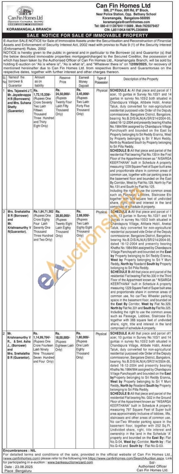 SCHEDULE A: All that piece and parcel of 1 acer, 13 guntas in Survey No.103/1 and 14 guntas in survey No. 103/2 both situated in Chandapura Village, Attibele Hobli, Anekal Taluk, duly converted for non-agricultural residential purposed vide Order of the Deputy commissioner, Bangalore District, Bangalore, bearing No.B.DIS/ALN(A)/SR/214/2004-05 dated 16-12-2004 and presently bearing Khatha No. 1984/994 assigned by Chandapura Village Panchayath and bounded on the East by Property belonging to Sri Reddy Eranna, West by Property belonging to Sri Y Muni Reddy, North by Roadand South by Property belonging to Sri Pilla Reddy.