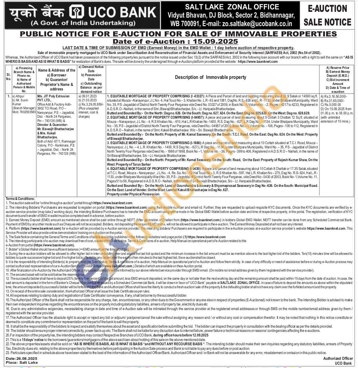 A Piece and Parcel of land and building measuring about 32.9 Satak or 14380 sq.ft. situated at Muoza-Narayanpur, J.LNo-4, Hal Touzi No-3, Khatian No. L.R-63 and 1081, Dag No. RS-626 and LR-1133, under Bhatpara Municipality, Ward No. 35, P.S-Jagaddal of District North Twenty Four Parganas vide Deed No. 03327 of 2009, in Book No. 1, Volume No. 2. Pages-4217 to 4233. Registered in A.D.SR.O-Naihati, in the name of Shri. Biswajit Bhattacharjee, S/o.-Lt. Haripada Bhattacharjee. Butted