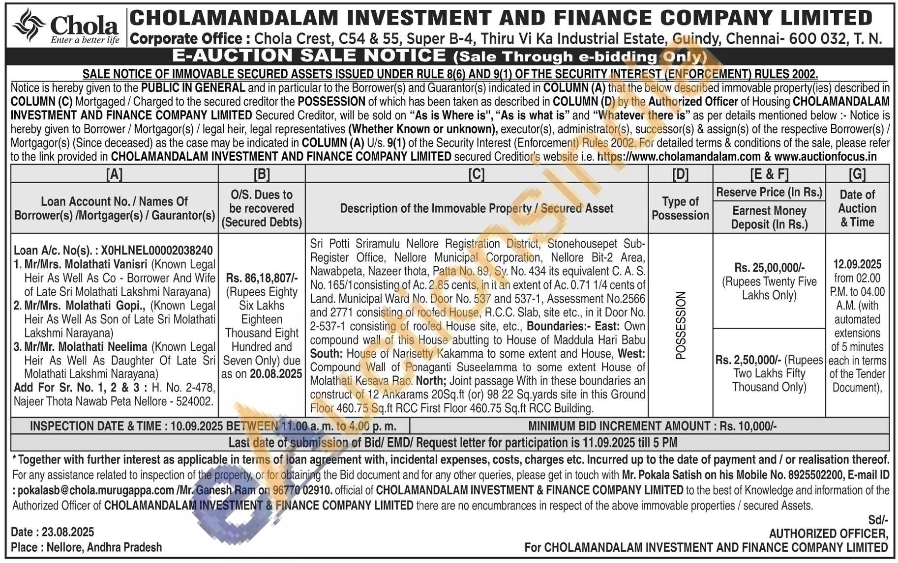 Sri Potti Sriramulu Nellore Registration District, Stonehousepet Sub-Register Office, Nellore Municipal Corporation, Nellore Bit-2 Area, Nawabpeta, Nazeer thota, Patta No. 89, Sy. No. 434 its equivalent C. A. S. No. 165/1 consisting of Ac. 2.85 cents, in it an extent of Ac. 0.71 1/4 cents of Land. Municipal Ward No. Door No. 537 and 537-1, Assessment No.2566 and 2771 consisting of roofed House, R.C.C. Slab, site etc., in it Door No. 2-537-1 consisting of roofed House site, etc., Boundaries:- East: Own compound wall of this House abutting to House of Maddula Hari Babu South: House of Narisetty Kakamma to some extent and House, West: Compound Wall of Ponaganti Suseelamma to some extent House of Molathati Kesava Rao. North; Joint passage With in these boundaries an construct of 12 Ankarams 20Sq.ft (or) 98 22 Sq.yards site in this Ground Floor 460.75 Sq.ft RCC First Floor 460.75 Sq.ft RCC Building