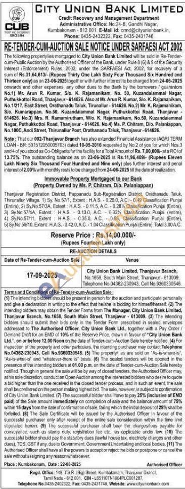 Immovable Property Mortgaged to our Bank (Property Owned by Ms. P. Chitram, D/o. Palaniappan) : Thanjavur Registration District, Pappanadu Sub-Registration District, Orathanadu Taluk, Thirunallur Village. 1) Sy. No.57/1, Extent: H.A.S.-0.20.0, A.C. -0,49 Classification Punjai (Entire), 2) Sy.No.57/3A, Extent: H.A.S.-0.11.5.A.C.-0.28 1/2 Classification Punjai (Entire), 3) Sy.No.57/4A. Extent: H.A.S. 0.13.0, A.C.0.32 1/2 Classification Punjai (entire), 4) Sy.No.57/11, Extent H.A.S.0.35.0, A.C. 0.86, Classification Punjai (Entire), 5) Sy.No.59/10, Extent: H.A.S.-0.42.0.A.C.-1.04 Classification Punjai (Entire), Total 3.00A.C