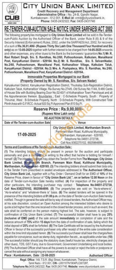 Immovable Properties Mortgaged to our Bank (Property Owned by Mr. S. Ravidhas, Sio. Selvam Nadar) : Kanyakumari District, Kanyakumari Registration District, Thuckalay Sub-Registration District, Kalkulam Taluk, Kothanalloor Village, Re-Survey No.274/6, Old Survey No. 114A, 9.480 Cents of House Site with Building Bearing Door No.02-60/1 of Kothanalloor Town Panchayat and all the Appurtenances thereon. Boundaries: East: C-Schedule Property, South Property of Thirumal, West: B-Schedule Property, North: D-Schedule Property, With Constructed Total Plinth Area with G.F.RCC-Actual 920 Sq. FtApproved Plan 810 Sq.Ft
