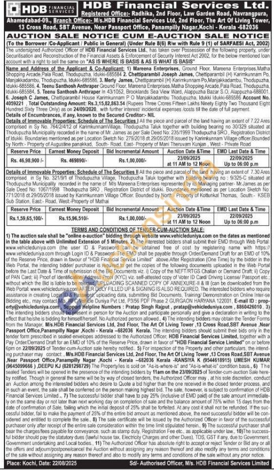 Details of Immovable Properties: Schedule of The Securities II All the piece and parcel of the land having an extent of 7.30 Ares comprised in Sy No. 321/9/1 of Thodupuzha Village, Thodupuzha Taluk together with building bearing no: 9/325-C situated at Thodupuzha Municipality recorded in the name of M/s Mareena Enterprises represented by its Managing partner- Mr. James as per Sale Deed No: 1067/1998 Thodupuzha SRO Registration District of Idukki. Boundaries mentioned as per Location Sketch No 771/2018 dt. 29/05/2018 issued by Karimkunnam Village Officer. Bounded by North- Property of Kottunkal Thomas, South: KSEB Sub Station, East:- Road, West-Property of Mathai