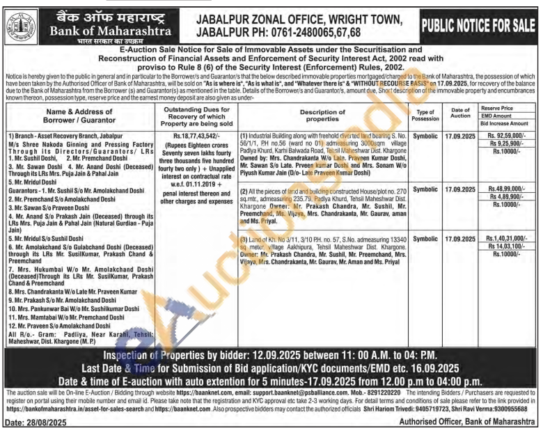(3) Land of Kh. No 3/11, 3/10 PH. no. 57. S.No. admeasuring 13340 sq meter, village Aakhipura, Tehsil Maheshwar Dist. Khargone. Owner: Mr. Prakash Chandra, Mr. Sushil, Mr. Preemchand, Mrs. Vijaya, Mrs. Chandrakanta, Mr. Gaurav, Mr. Aman and Ms. Priyal