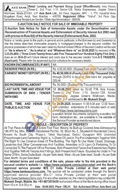 All That Piece And Parcel Of Entire First Floor. Having Its Built-up Covered Area Admeasuring 186.975 Sq. Mtrs, Built On Residential Plot No. 39, Block No. E, Situated At Residential Colony Known As South City, Phase-ii, Tehsil Wazirabad, District Gurugram With Undivided Proportionate Land Ownership Right 1.e. Share Of Land in The Piot Underneath Together With The Right To Use Common Areas Of The Building. The Right To Use Water Closet, Drainage, Lavatories And Other Conveniences And Facilities, Amenities in Or Upon Or Pertaining To Or Connected To The Flat/unit/ Office Premises, Both Present And Future And Easementary Rights And Togather With All Fixtures And Fittings, Both Present And Future Bounded As Under In The Name Of Mrs. Sonia Dutta East-As per Sale deed, West-As per Sale deed, South-As per Sale deed, North-As per Sale deed