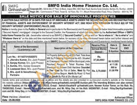 "A Property Admesuring 42X23 Feet, Total Area 996 Sq Ft Bearing II Municipal No 425, Situaled At Chaomandi Roorkee (Within Municipal Limits Roorkee) Pargana & Tehsil Roorkee Dist Sharanpur At Present Distt Haridwar Bounded In The East By Plot of Seller, West By Plot of Smt. Fatima Begum, North By Road 12 Feet Wide South By Plot of Shri Murari Lal