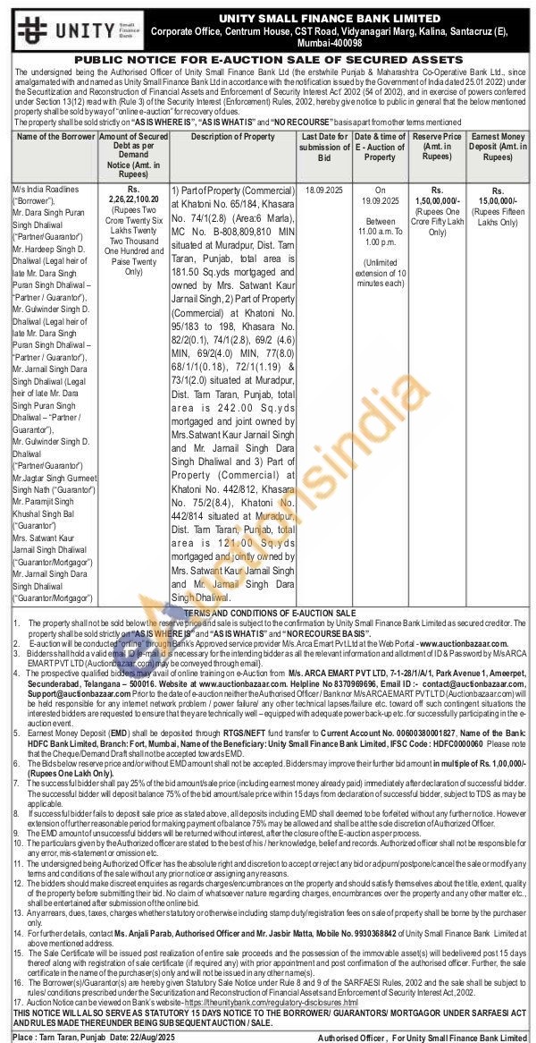 Partof Property (Commercial) at Khatoni No. 65/184. Khasara No. 74/1(2.8) (Area:6 Maria), MC No. B-808.809.810 MIN situated at Muradpur, Dist. Tam Taran, Punjab, total area is 181.50 Sq.yds mortgaged and owned by Mrs. Satwant Kaur Jarnail Singh, 2) Part of Property (Commercial) at Khatoni No. 95/183 to 198, Khasara No. 82/20.1), 74/1 (2.8), 69/2 (4.6) MIN, 69/24.0) MIN, 77(8.0) 68/1/1(0.18), 72/1(1.19) & 73/1(2.0) situated at Muradpur, Dist. Tarn Taran, Punjab, total area is 242.00 Sq.yds mortgaged and joint owned by Mrs. Satwant Kaur Jarnail Singh and Mr. Jamail Singh Dara Singh Dhaliwal and 3) Part of Property (Commercial) at Khatoni No. 442/812, Khasara No. 75/2(8.4), Khatoni No. 442/814 situated at Muradpur, Dist. Tam Taran, Punjab, totall area is 121.00 Sq.yds mortgaged and jointly owned by Mrs. Salwant Kaur Jamal Singh and Mr. Jamail Singh Dara Singh Dhaliwal.