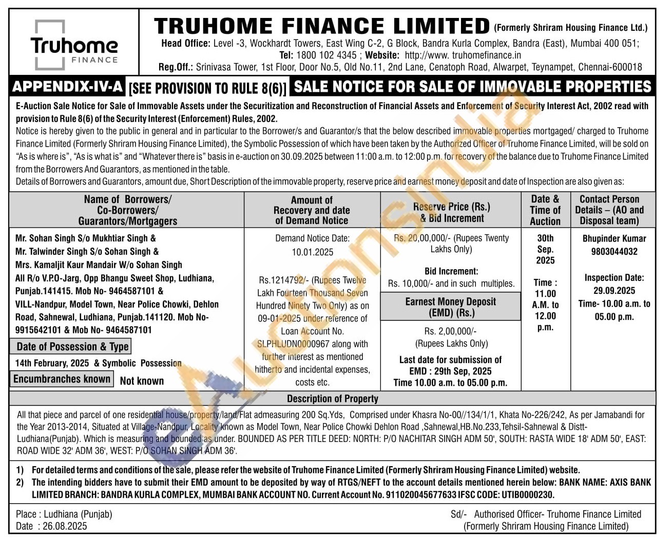 All that piece and parcel of one residential house/property/land/Flat admeasuring 200 Sq. Yds, Comprised under Khasra No-00//134/1/1, Khata No-226/242, As per Jamabandi for the Year 2013-2014, Situated at Village-Nandpur, Locality known as Model Town, Near Police Chowki Dehlon Road, Sahnewal, HB. No.233, Tehsil-Sahnewal & Distt-Ludhiana (Punjab). Which is measuring and bounded as under. BOUNDED AS PER TITLE DEED: NORTH: P/O NACHITAR SINGH ADM 50', SOUTH: RASTA WIDE 18' ADM 50', EAST: ROAD WIDE 32 ADM 36', WEST: P/O SOHAN SINGH ADM 36