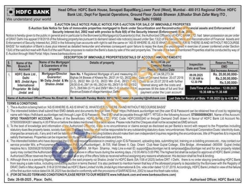 Registered Mortgage of Land measuring 23 Bighas 04 Biswas of Khasra No. 26/21 (4-12), 26/22 Min (2-3), 26/22 Min (2-13), 26/23 Min (0-4), 26/23 (1-0), 26/30 (0-4), 29/1 (4-16), 29/2 (4-16) 29/3/1 (0-18), 29/3/2 (0-7), 29/8 Min (0-11) and 29/9/1 Min (1-0) situated in the Revenue Estate of village Hamidpur, Delhi
