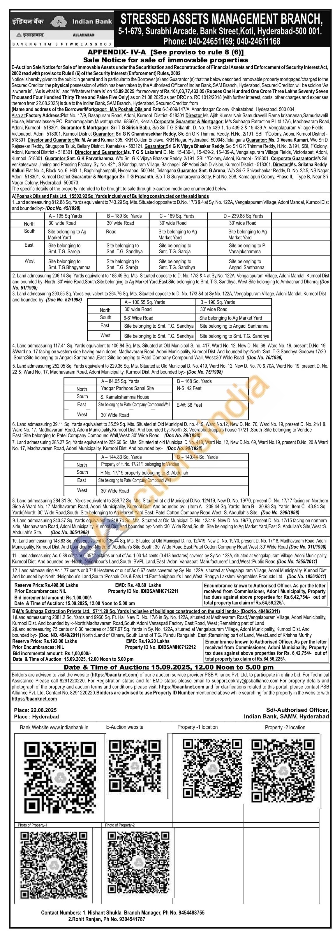 A)Poshak Oils and Fats Ltd. 15502.92 Sq. Yards inclusive of Building constructed on the said lands 1.Land admeasuring 812.88 Sq. Yards equivalent to 743.29 Sq. Mts. Situated opposite to D.No. 17/3 & 4 at Sy. No. 122A, Vengalapuram Village, Adoni Mandal, Kurnool Dist and bounded by:- (Doc No. 45/1998) 2. Land admeasuring 206.14 Sq. Yards equivalent to 188.49 Sq. Mts. Situated opposite to D. No. 17/3 & 4 at Sy.No. 122A, Vengalapuram Village, Adoni Mandal, Kurnool Dist and bounded by:-North :30' wide Road, South: Site belonging to Ag Market Yard, East:Site belonging to Smt. T.G. Sandhya, West:Site belonging to Ambachand Dhanraj (Doc No. 51/1998) 3. Land admeasuring 290.55 Sq. Yards equivalent to 264.76 Sq. Mts. Situated opposite to D. No. 17/3 &4 at Sy.No. 122A, Vengalapuram Village, Adoni Mandal, Kurnool Dist and bounded by:-(Doc No. 52/1998) 4. Land admeasuring 117.41 Sq. Yards equivalent to 106.84 Sq. Mts. Situated at Old Municipal S. no. 417, Ward No. 12, New D. No. 68, Ward No. 19, present D.No. 19 &Ward no. 17 facing on western side having main doors, Madhavaram Road, Adoni Municipality, Kurnool Dist. And bounded by:-North : Smt. T G Sandhya Godown 17/20 South: Site belonging to Angadi Santhanna, East :Site belonging to Patel Company Compound Wall, West:30' Wide Road (Doc No. 76/1998) 5. Land admeasuring 252.05 Sq. Yards equivalent to 229.36 Sq. Mts. Situated at Old Municipal D. No. 419, Ward No. 12, New D. No. 70 & 70A, Ward No. 19, present D. No. 22 &; Ward No. 17, Madhavaram Road, Adoni Municipality, Kurnool Dist. And bounded by:- (Doc No. 75/1998)6. Land admeasuring 39.11 Sq. Yards equivalent to 35.59 Sq. Mts. Situated at Old Municipal D. no. 419, Ward No. 12, New D. No. 70, Ward No. 19, present D. No. 21/1 & Ward No. 17, Madhavaram Road, Adoni Municipality, Kurnool Dist. And bounded by:-North :S. Veerabhadrappa's house 17/21, South: Site belonging to Vendee East:Site belonging to Patel Company Compound Wall, West: 30' Wide Road. (Doc No. 89/1998) 7. Land admeasuring 285.27 Sq. Yards equivalent to 259.60 Sq. Mts. Situated at old Municipal D.No. 418, Ward No. 12, New D.No. 69, Ward No. 19, present D.No. 20 & Ward No. 17, Madhavaram Road, Adoni Municipality, Kurnool Dist. And bounded by:- (Doc No. 90/1998) 8. Land admeasuring 284.31 Sq. Yards equivalent to 258.72 Sq. Mts. Situated at old Municipal D.No. 12/419, New D. No. 19/70, present D. No. 17/17 facing on Northern Side & Ward No. 17 Madhavaram Road, Adoni Municipality, Kurnool Dist. And bounded by:- (Item A-209.44 Sq. Yards; Item B-30.93 Sq. Yards; Item C-43.94 Sq. Yards)North: 30' Wide Road, South: Site belonging to Ag Market Yard, East: Patel Cotton Company Road, West: S. Abdullah's Site (Doc No. 296/1998) 9. Land admeasuring 240.37 Sq. Yards equivalent to 218.74 Sq. Mts. Situated at Old Municipal D. No. 12/419, New D. No. 19/70, present D. No. 17/15 facing on northern side, Madhavaram Road, Adoni Municipality, Kurnool Dist. And bounded by:-North:30' Wide Road, South: Site belonging to Ag Market Yard, East S. Abdullah's Site, West :S. Abdullah's Site. (Doc No. 305/1998) 10. Land admeasuring 148.83 Sq. Yds. Equivalent to 135.44 Sq. Mts. Situated at Old Municipal D. no. 12/419, New D. No. 19/70, present D. No. 17/18, Madhavaram Road, Adoni Municipality, Kurnool Dist. And bounded by:-North: S. Abdullah's Site, South: 30' Wide Road, East:Patel Cotton Company Road, West :30' Wide Road (Doc No. 311/1998) 11. Land admeasuring Ac. 0.88 cents or 0.357 hectares or out of Ac. 1.03 1/4 cents (0.418 hectares) covered by Sy.No. 122A, situated at Vengalapuram Village, Adoni Municipality, Kurnool Dist. And bounded by:-North :Neighbour's Land, South : BVPL Land, East : Adoni Vanaspati Manufacturers' Land, West : Public Road. (Doc No. 1855/2011) 12. Land admeasuring Ac 1.77 cents or 0.718 Hectares or out of Ac 6.67 cents covered by Sy. No. 122A, situated at Vengalapuram Village, Adoni Municipality, Kurnool Dist. And bounded by:-North : Neighbour's Land, South: Poshak Oils & Fats Ltd.East:Neighbour's Land, West :Bhagya Lakshmi Vegetables Products Ltd., (Doc No. 1856/2011)
